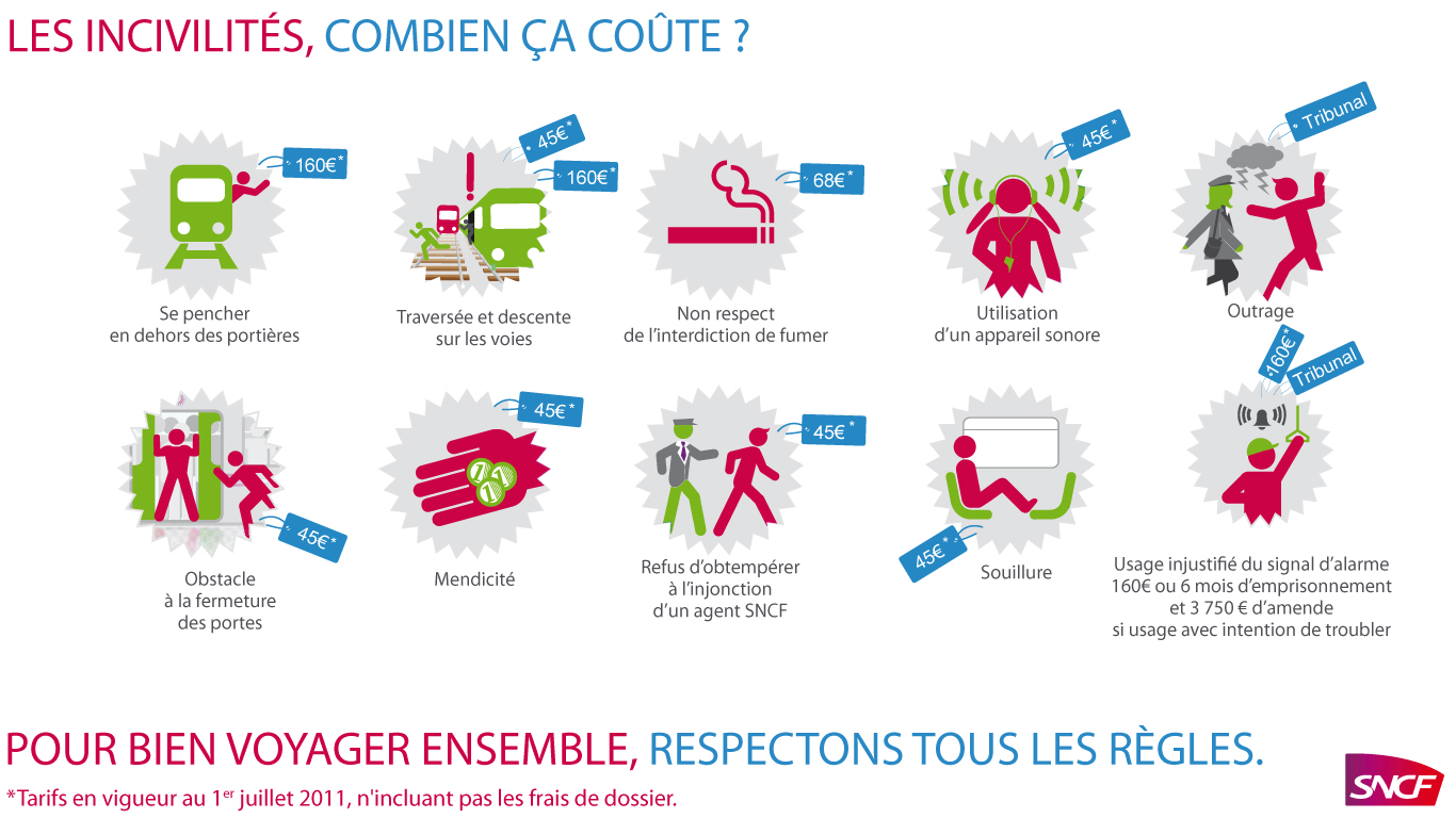 Le problème, c’est que je ne peux pas donner plus de précisions parce que je ne constate pas les incivilités spécialement aux mêmes horaires. Par exemple, un jour, C’est quelqu’un qui a un comportement qui perturbe les usagers, un autre, c’est la musique qu’on entend(sur téléphone mobile et sans écouteurs!). De plus, j’ai un doute mais il me semble avoir vu cette affiche en gare. Sans oublier les pieds sur les sièges et ça également dans le Francilien, mais quel que soit le type de train, ce n’est pas une raison pour déranger les usagers.