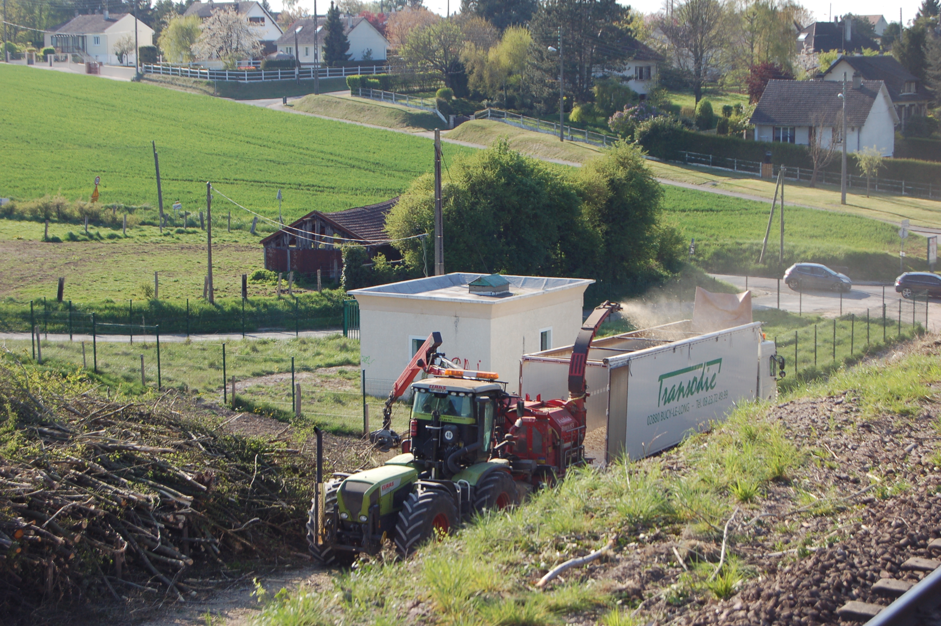 Sur place, l’ensemble des branches et troncs jusqu’à 15-20 cm de diamètre environ sont réduits en copeaux, regroupés et évacués (ils serviront de bois de chauffage). Les plus gros troncs sont acheminés par voie ferrée sur des zones où ils sont soit broyés (les copeaux sont acheminés et traités dans l’Oise, voir la photo), soit stockés pour être débités.