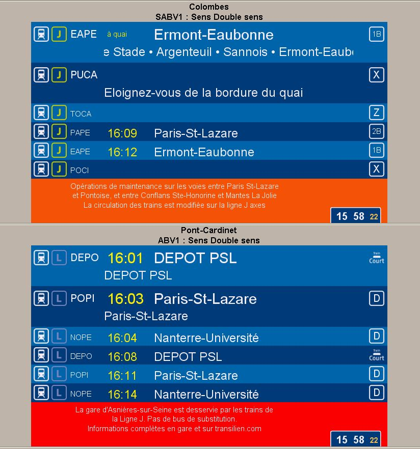 C’est vrai que dans ma gare,si le trafic est habituel,le fond d’écran est aussi en orange quand il y a écrit des travaux.Mais Franck,à Saint-Michel Notre-Dame,lorsque le trafic est habituel,le fond d’écran est en mauve et effectivement,lors de perturbations,il prend une couleur.C’est pour ça que je ne comprends pas pourquoi dans certaines gares,l’écran possède un fond orange si c’est seulement des travaux qui sont annoncés qui défilent.