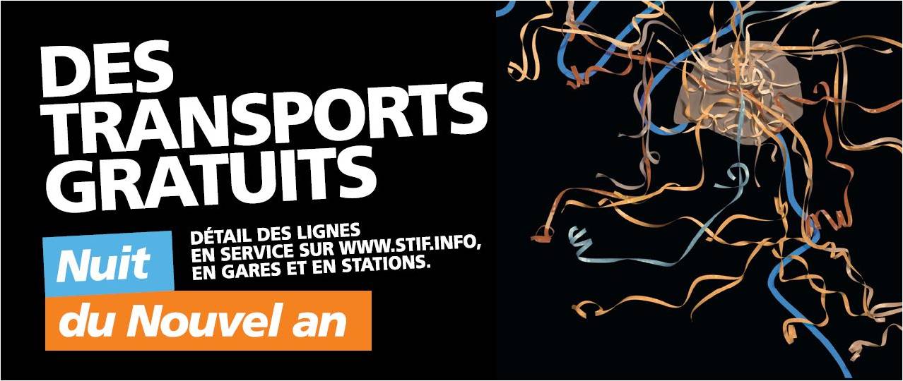 Comme chaque année, le STIF met en place un dispositif particulier pour la nuit du nouvel an. Toute la nuit, les transports seront donc gratuits pour tous et vous pourrez vous déplacer librement en transports en commun à Paris et en Région parisienne. Les métros, trains, RER et bus Noctilien circuleront gratuitement du 31 décembre à 17h au 1er janvier à 12h.