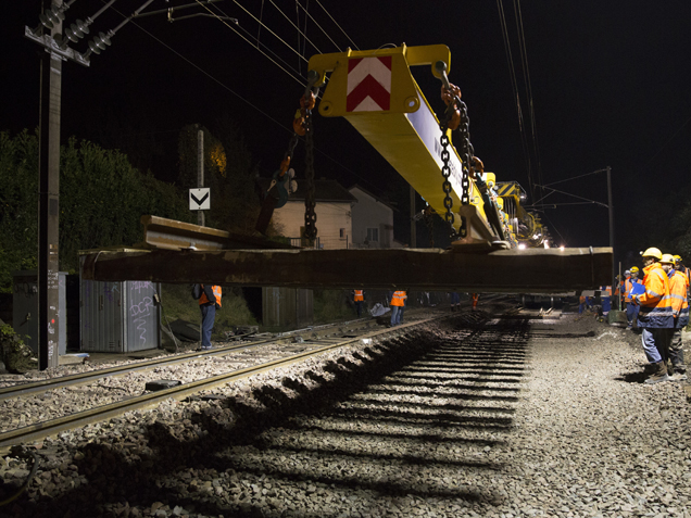 Depuis 2014, sur des chantiers de renouvellement de voie et d’aiguillage La grue Kirow est capable de soulever des charges de 40 tonnes et de 28 mètres de long. Associée au wagon-pupitre, qui achemine les aiguillages directement depuis l’atelier de fabrication, elle permet de diviser par deux le temps habituellement nécessaire à ces opérations.