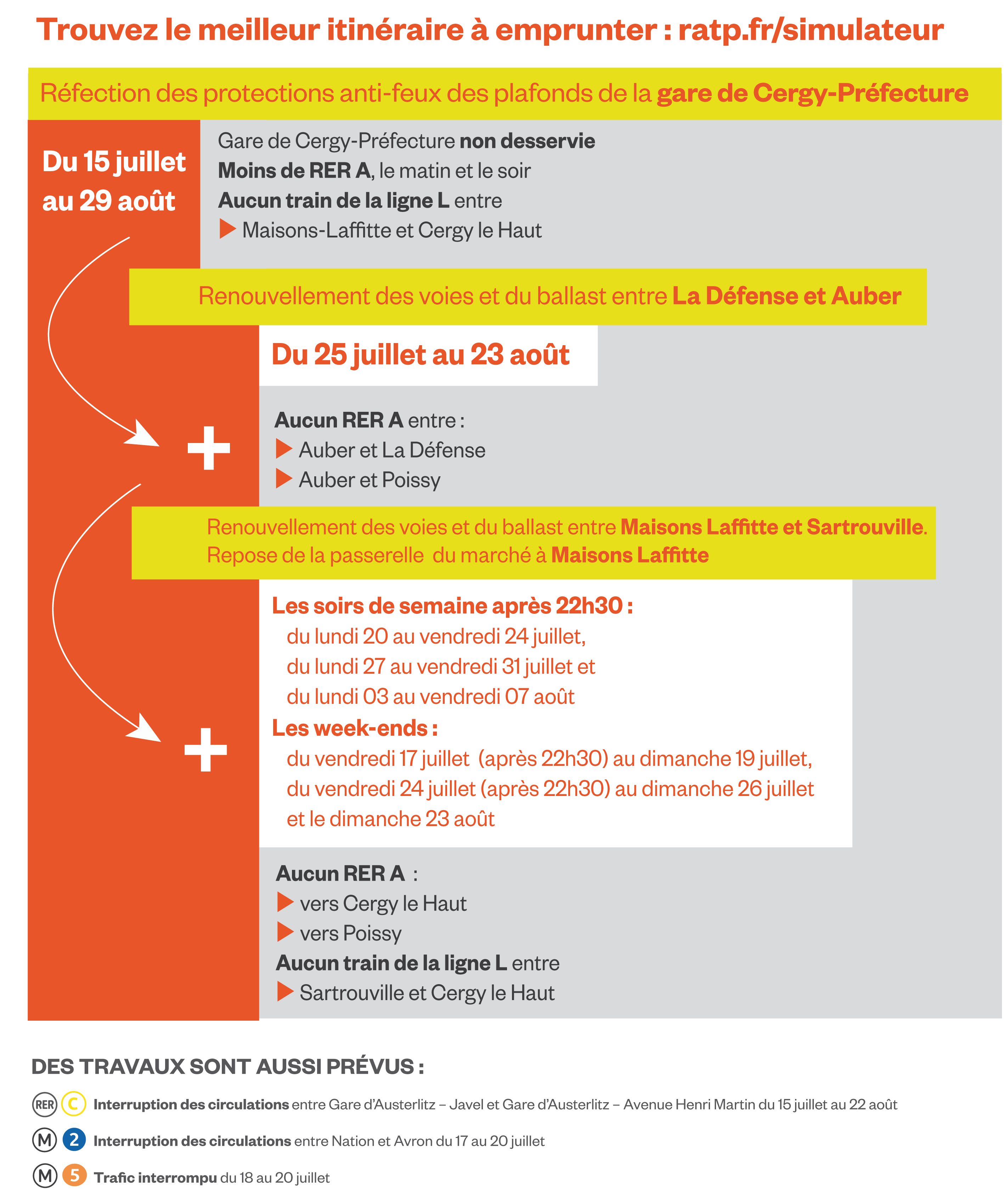 Bonjour, il nous semble important, par anticipation, de vous informer de ce qui se passe en matière de travaux (les travaux menés cet été sur la A sont d’une ampleur inédite : la SNCF et la RATP profitent de cette période de moindre affluence pour mener des travaux chacune sur leur tronçon) et de vous faire part des dispositifs prévus de prise en en charge par ailleurs. Cela fait partie de nos engagements que de vous informer en amont pour rassurer les éventuelles craintes qui pourraient s’exprimer.