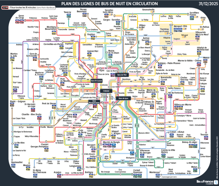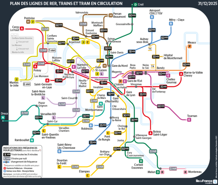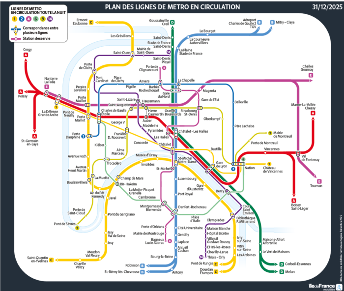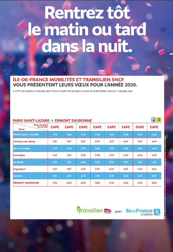 🎆 Du mardi 31 décembre 2025 à partir de 17h jusqu’au mercredi 1er janvier 2026 à 12h, les transports en commun sont ouverts et gratuits sur l’ensemble de l’Île-de-France (hors liaisons vers les aéroports).