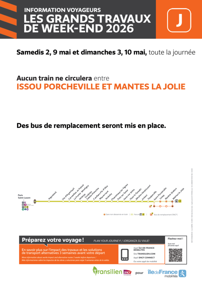 Afin de poursuivre l’amélioration et la modernisation de vos infrastructures ferroviaires, aucun train ne circulera entre Issou Porcheville et Mantes-la-Jolie les samedis 2 et 9 mai et dimanche 3 et 10 mai 2026 toute la journée.