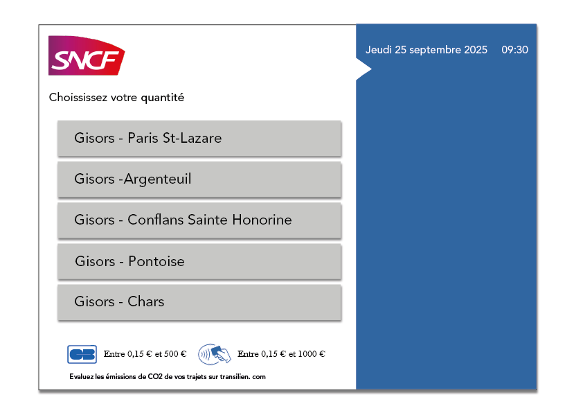 Pour vous accompagner dans l’achat de votre titre, ce visuel présente la vue de l’automate que vous rencontrez en gare de Gisors. Je vous rappelle que cet automate vous propose les 5 destinations principale au départ de cette gare.
