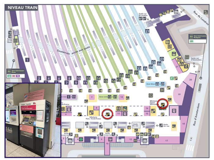 Pour vous aider, un plan de la gare de Paris Saint-Lazare est mis à disposition ci-dessous, avec la localisation précise des automates concernés :